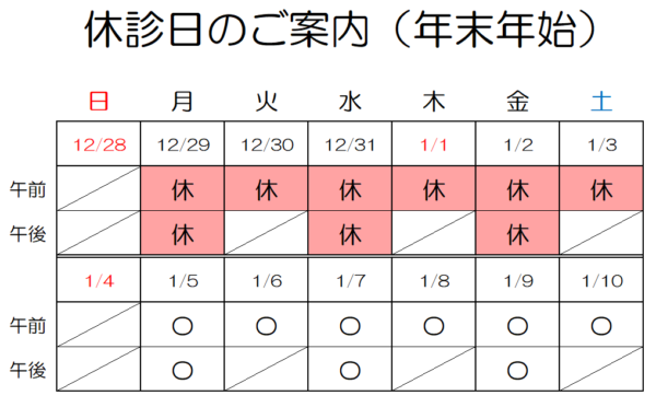 12月29日(月)~1月3日(土)まで休診とさせていただきます。